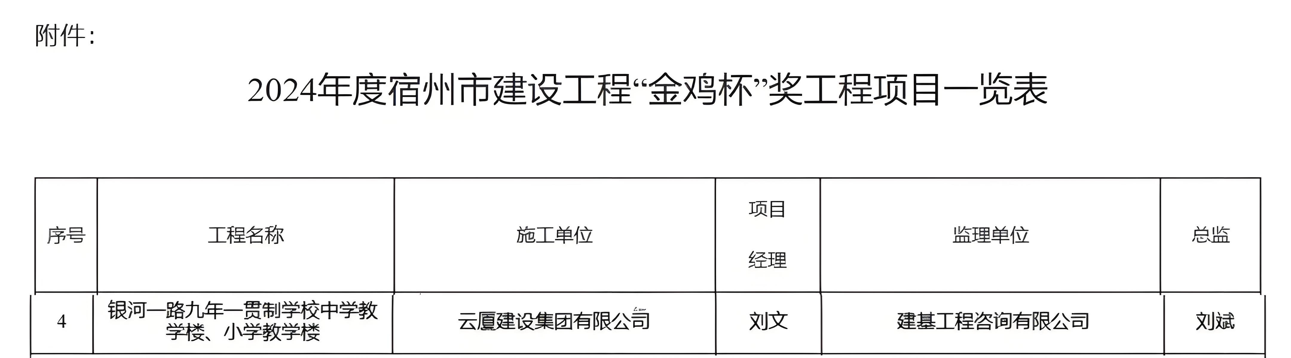近日,由公司監(jiān)理的銀河一路九年一貫制學校中學教學樓、小學教學樓項目,榮獲2024年度宿州市建設工程"金雞杯"獎(市優(yōu)質(zhì)工程),項目總監(jiān)理工程師劉斌同志獲評"優(yōu)秀總監(jiān)理工程師"稱號。