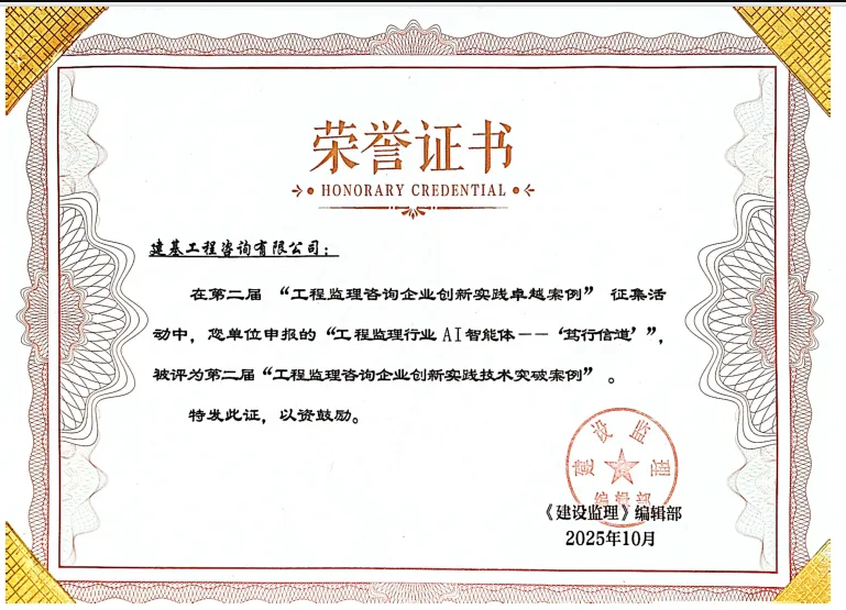 2025年10月30日,2025建設(shè)監(jiān)理創(chuàng)新發(fā)展交流會(huì)(第十期)在江蘇南京召開。公司《工程監(jiān)理行業(yè)AI智能體——“篤行信道”》案例,斬獲“技術(shù)突破案例”獎(jiǎng)項(xiàng),并在會(huì)上接受表彰。