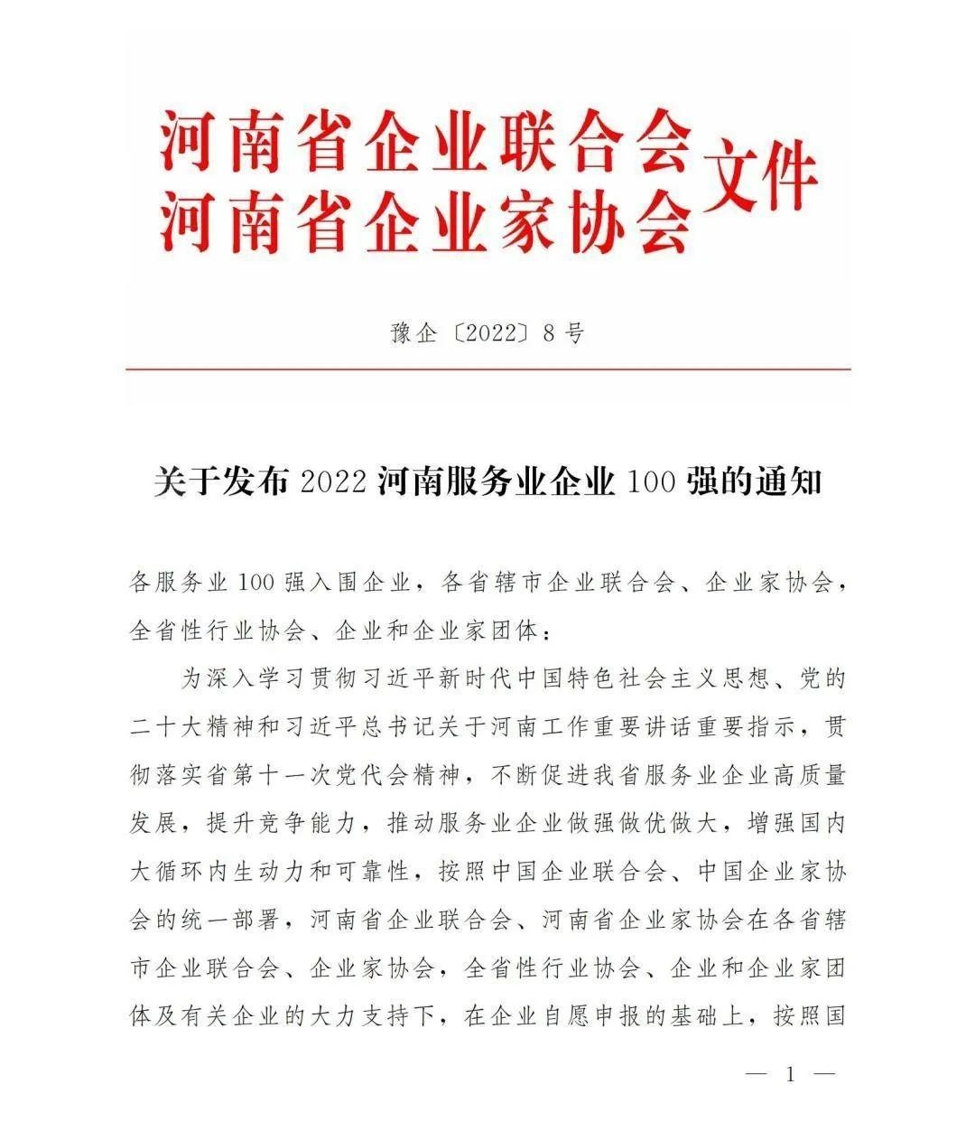 “2022年河南服務(wù)業(yè)企業(yè)100強(qiáng)”榜單位居73名