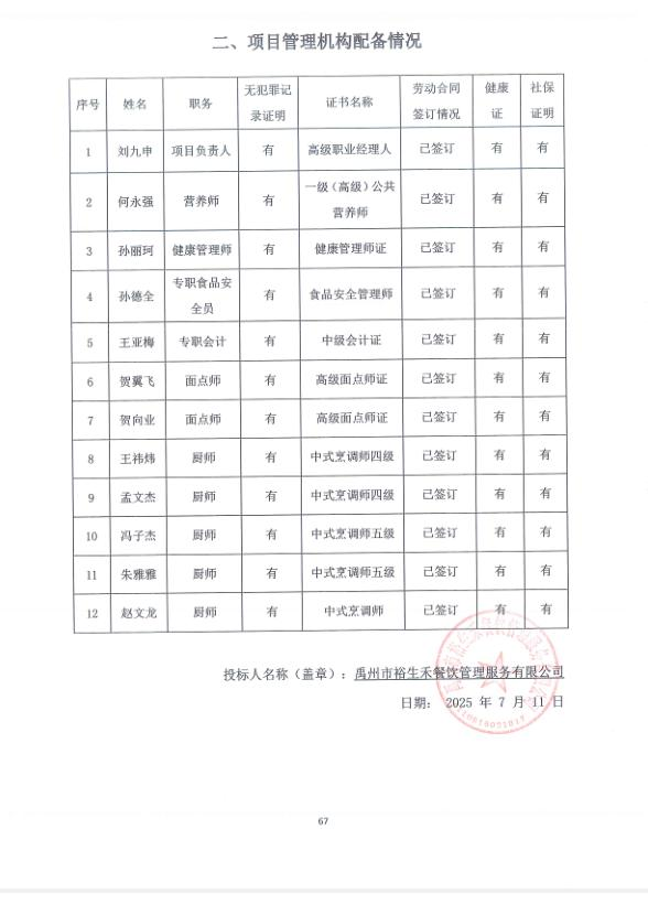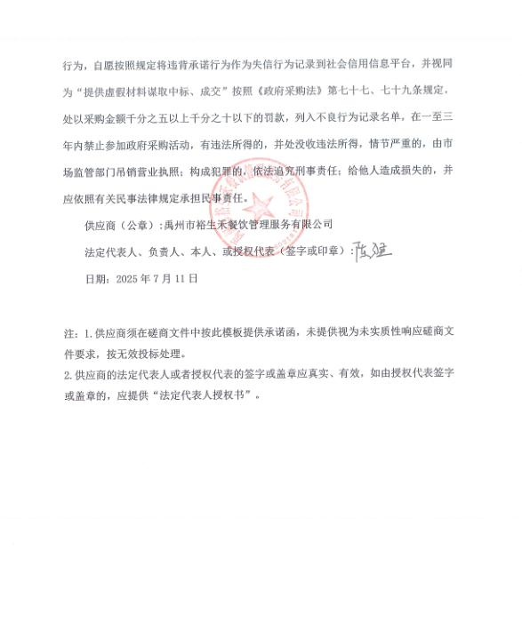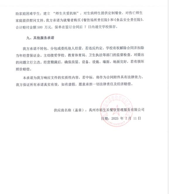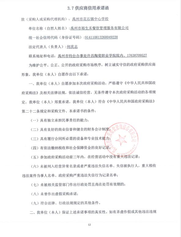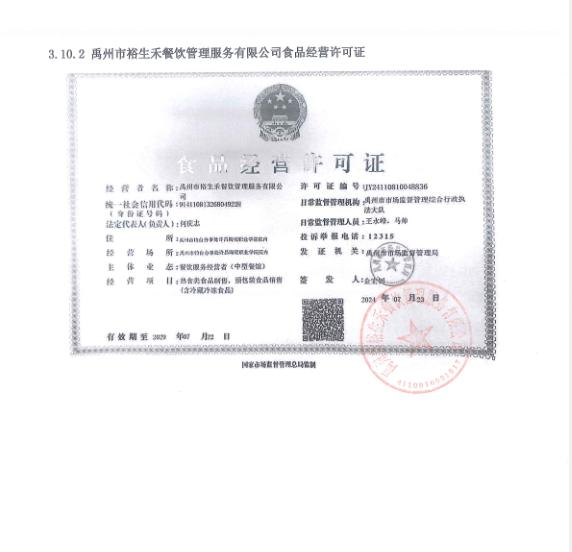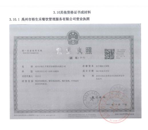 第一成交候選人:禹州市裕生禾餐飲管理服務有限公司