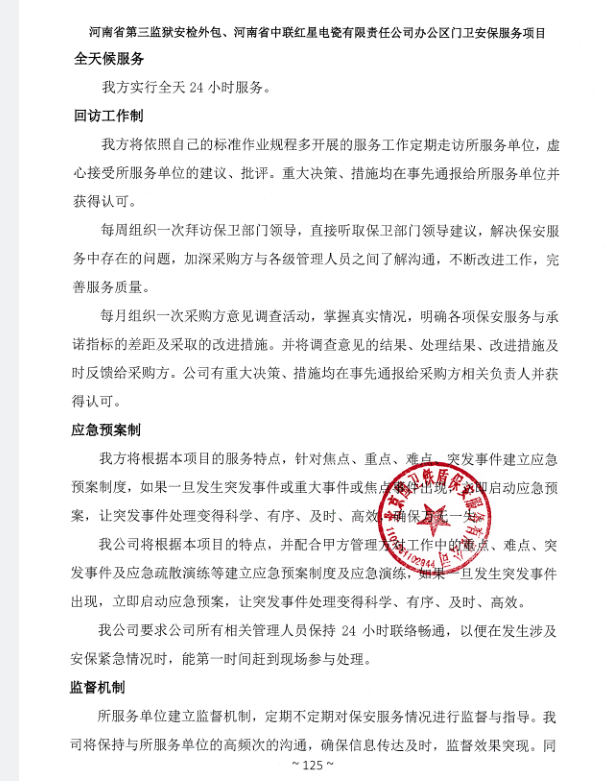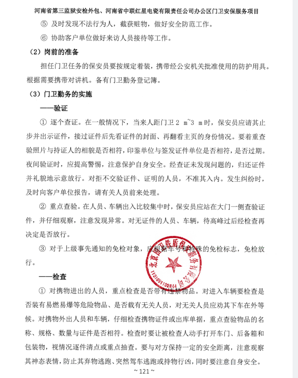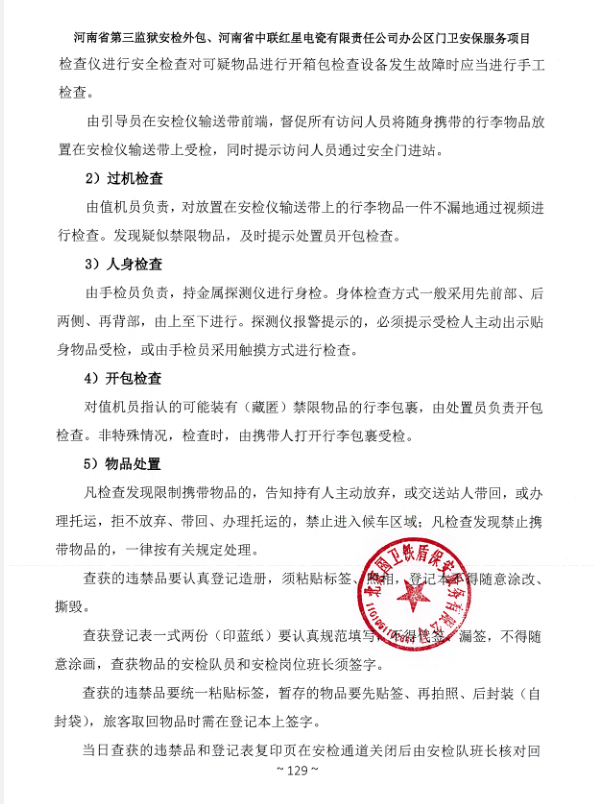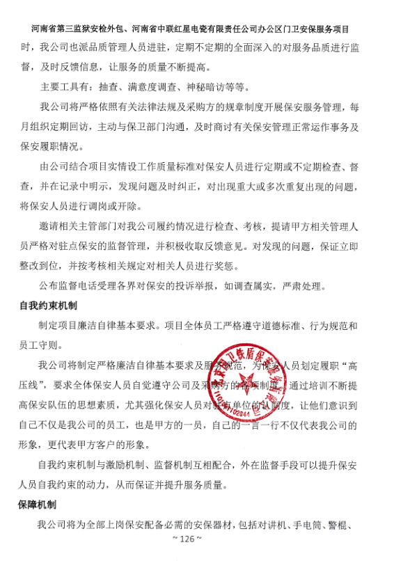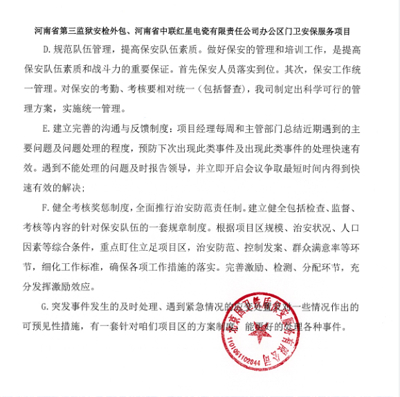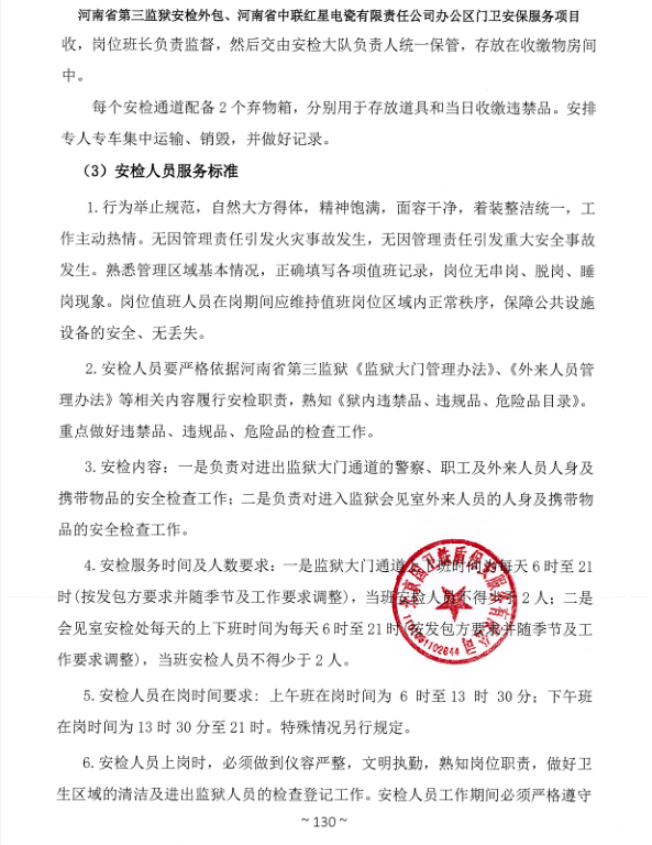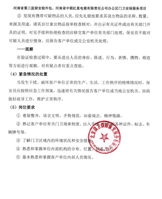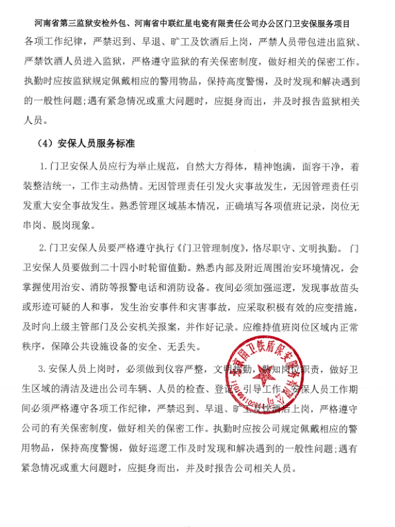 一、項(xiàng)目名稱:河南省第三監(jiān)獄安檢外包、河南省中聯(lián)紅星電瓷有限責(zé)任公司辦公區(qū)門衛(wèi)安保服務(wù)項(xiàng)目