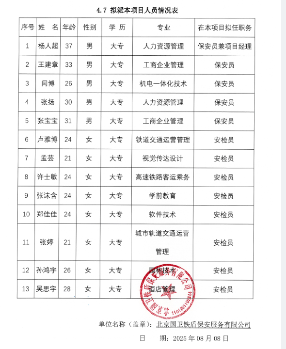本次采購內(nèi)容為聘請不少于13名安檢安保人員(8名女性安檢人員及5名男性安保人員)在采購人指定崗位提供安檢安保服務(wù)(詳見競爭性磋商文件第二章項(xiàng)目需求) | 北京國衛(wèi)鐵盾保安服務(wù)有限公司 | 423000.00 |