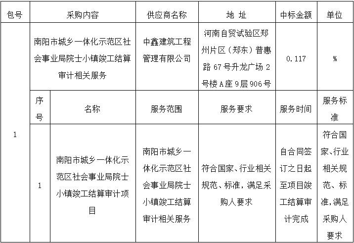 南陽市城鄉(xiāng)一體化示范區(qū)社會事業(yè)局院士小鎮(zhèn)竣工結(jié)算審計(jì)項(xiàng)目成交公告
