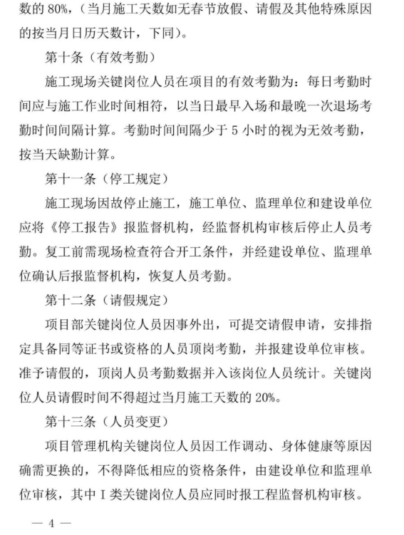 施工現(xiàn)場關(guān)鍵崗位人員考勤月到崗率不得低于當(dāng)月施工天數(shù)的80%,(當(dāng)月施工天數(shù)如無春節(jié)放假、請假及其他特殊原因的按當(dāng)月日歷天數(shù)計,下同)。